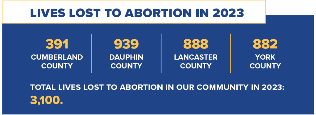 35,412 babies’ lives were lost to abortion in Pennsylvania in 2023* — 3,100 in our very own communities, in Cumberland, Dauphin, Lancaster, and York counties.